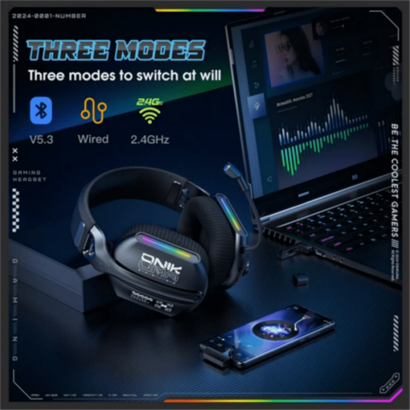 The Onikuma GT808 is a tri-mode gaming headset that offers both wireless and wired connectivity options. It features 2.4GHz wireless, Bluetooth 5.3, and wired (3.5mm) modes for versatile use across different platforms like PC, PlayStation, Switch, and mobile devices. The headset includes 40mm drivers for high-quality audio, a detachable, noise-canceling microphone, and customizable RGB lighting. It is designed with an ergonomic and comfortable fit, featuring breathable, sweat-wicking memory foam earcups.