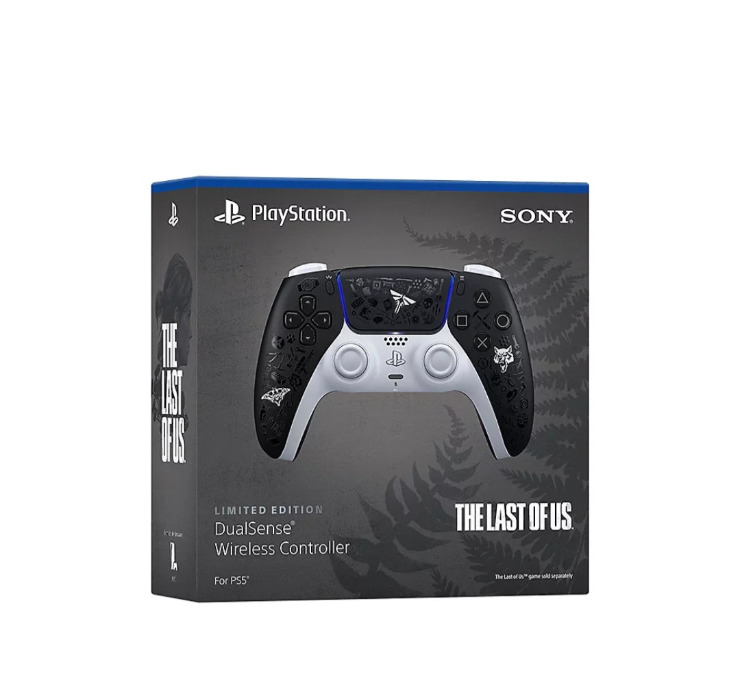 The Last of Us Limited Edition DualSense Wireless Controller for PlayStation 5 features a unique black and white design with glossy icons inspired by the game. It includes elements like the Firefly logo and symbols representing Ellie and Abby, connecting to both The Last of Us Part I and Part II. The controller retains the standard DualSense features like haptic feedback, adaptive triggers, and a built-in microphone.