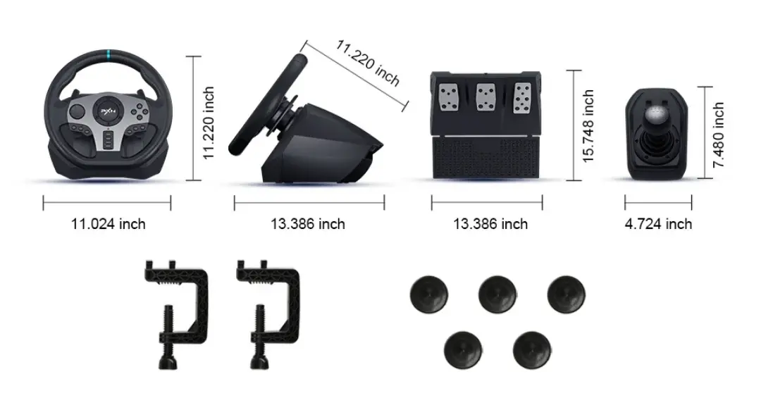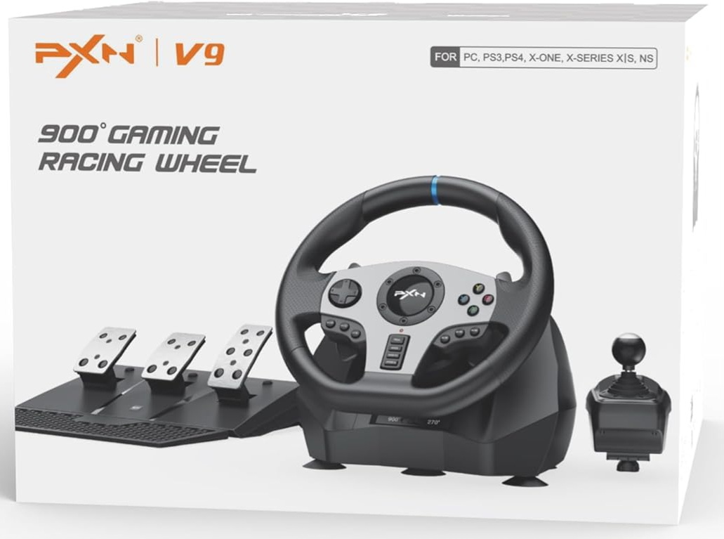 In essence, the PXN V9 is an entry-level racing wheel that aims to provide a realistic and immersive racing experience across multiple platforms with its key features, including dual vibration, adjustable rotation, and a complete set of driving controls.