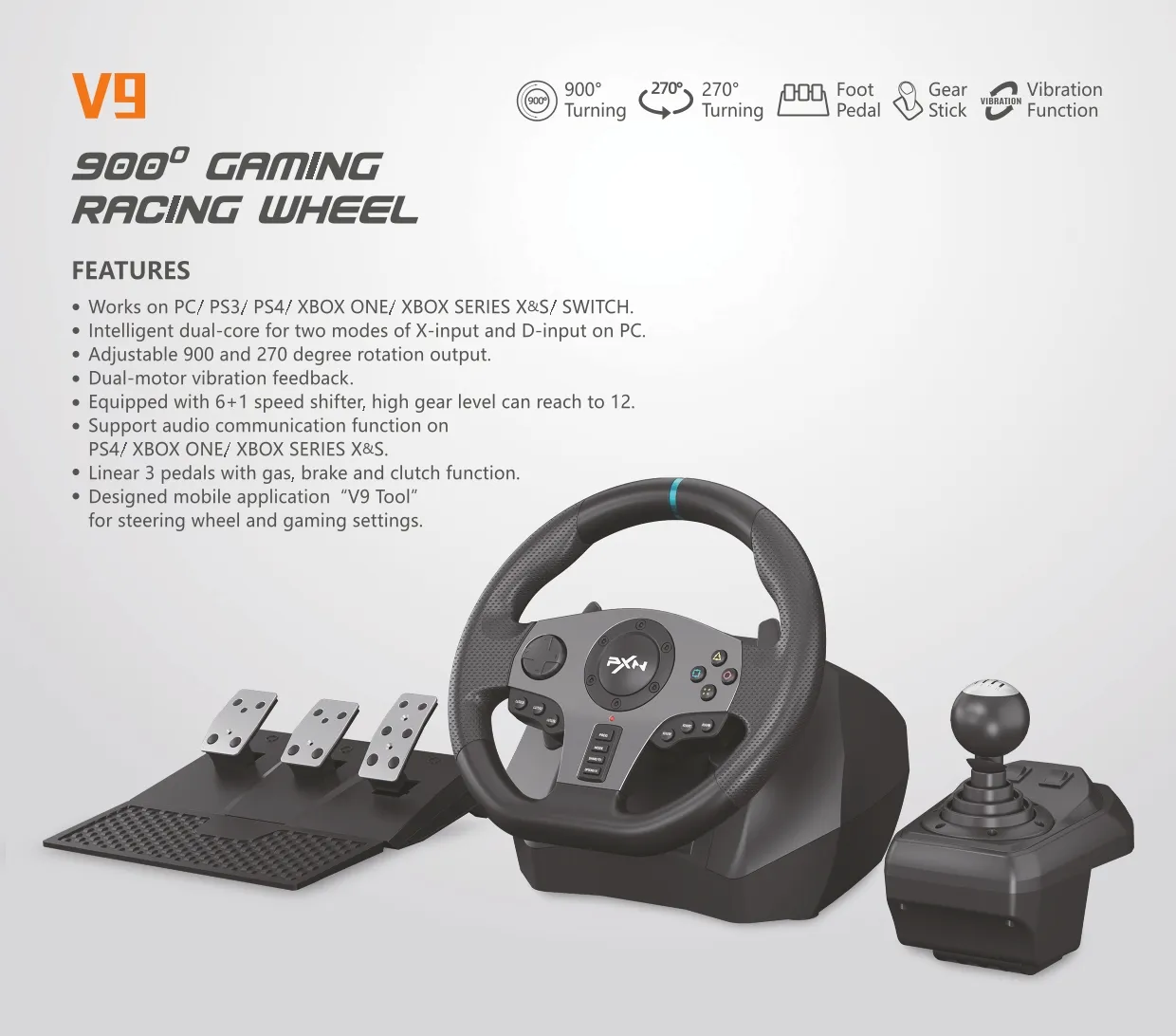 The PXN V9 is a racing wheel designed for a variety of gaming platforms including PC, PS3, PS4, Xbox One, Xbox Series X/S, and Nintendo Switch. It features a 270/900° rotation angle, dual vibration motors for realistic feedback, and includes a 6+1 gear shifter and three pedals. The pedals have Hall effect sensors and offer adjustable resistance.